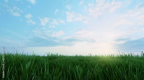Fototapeta premium Expansive Verdant Meadow Under a Tranquil Blue Sky with Distant Horizon