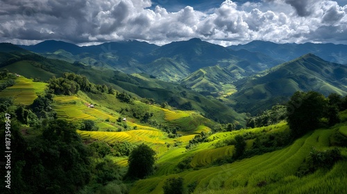 Fototapeta premium Expansive vibrant green rice paddies on lush mountainsides under a dramatic...