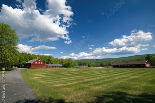 © purrfiction, Obraz premium Expansive view of a serene countryside landscape with red barns under a bright blue sky