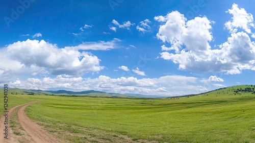 © tao, Fototapeta premium Expansive view of a wide open field with green wheat and grass, dirt road, and an isolated tree under the blue sky, capturing tranquility and harmony.