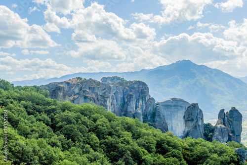 © aminkorea, Naklejka premium Expansive view of cliffs and mountain ranges under a cloudy blue sky in Meteora Greece