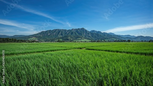 © TheWaterMeloonProjec, Fototapeta premium Expansive view of cultivated land with mountainous backdrop