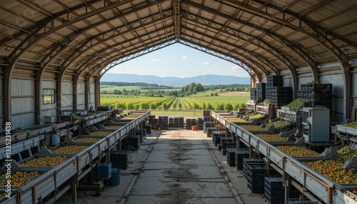 © Kitta Studio, Fototapeta premium Expansive View of Fruit Storage Facility Surrounded by Nature