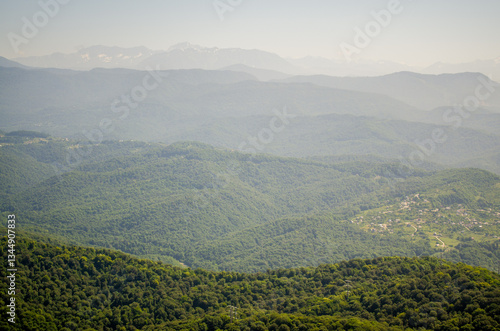 Fototapeta premium Expansive view of lush green forests and majestic mountains under hazy sky. Distant peaks blend into horizon, creating layers of tranquil scenery. Soft, natural lighting enhances serene atmosphere
