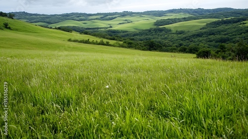 Fototapeta premium Expansive view of rolling green hills dotted with dense forest under a cloudy...