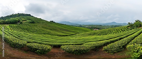 Obraz premium Expansive view of verdant tea plantation hills with rows of green bushes in a picturesque landscape under cloudy sky : Generative AI