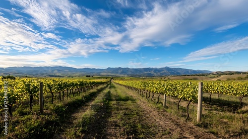 Fototapeta premium Expansive vineyard landscape showcasing lush green vines under a bright blue sky with clouds : Generative AI