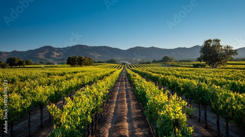 © kirania, Naklejka premium Expansive Vineyard Rows Under a Clear Blue Sky with Distant Mountains.