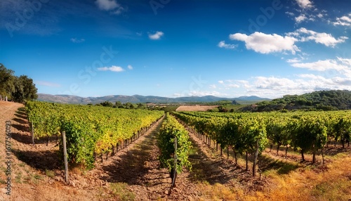 © Annalise, Fototapeta premium expansive vineyard with rows of grapevines under a bright blue sky with scattered clouds surrounded by trees and distant hills in warm sunlight