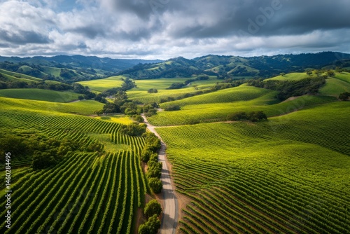Fototapeta premium Expansive vineyards cover the gentle hills, with winding roads visible in the...