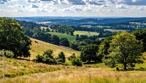 © Peraza, Naklejka premium Expansive vista of a valley framed by vibrant greenery under a partly cloudy sky, featuring rolling hills and fields