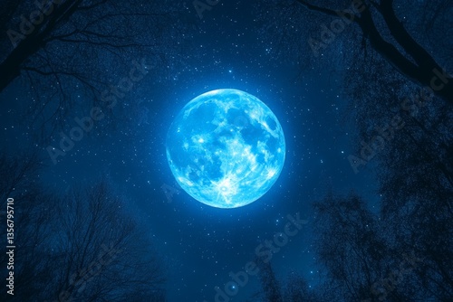 © ChaoticMind, Fototapeta premium Expect a mesmerizing night with a bright blue moon illuminating the star-filled sky above silhouetted trees in a serene landscape
