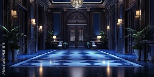 Fototapeta premium expensive hotel lobby with luxury indigo wooden panels, carvings royal style and elegant glowing floor