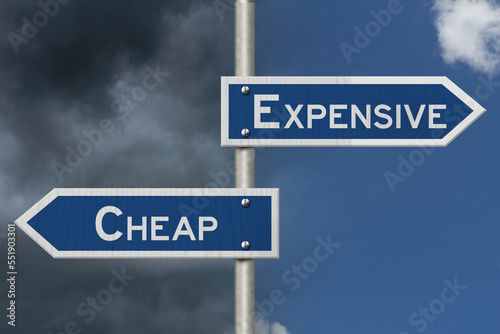 © Karen Roach, Obraz premium Expensive versus Cheap blue road sign