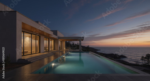 Fototapeta premium Experience luxurious living with a modern oceanfront home and stunning infinity pool at twilight, offering serenity and breathtaking views for upscale lifestyle designs