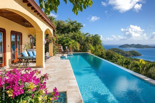 © Mitchell, Fototapeta premium Experience luxurious serenity elegant coastal villa with infinity pool overlooking stunning ocean views