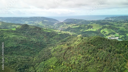 © Vladimir, Fototapeta premium Experience the breathtaking aerial view showcasing the lush green hills alongside the ocean