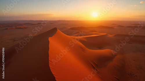 © Mr. Bolota, Naklejka premium Experience the breathtaking beauty of the Namib Desert at sunset, where sharp-ridged dunes meet the horizon in a stunning orange glow.