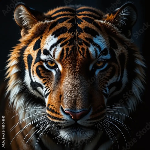 © OmRioRio, Fototapeta premium Experience the captivating gaze of a majestic tiger, showcasing its striking orange and black fur in stunning detail. This close-up portrait highlights the tiger's powerful features. Generative AI.
