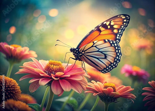 Fototapeta premium Experience the delicate beauty of a vintage monarch butterfly resting on a flower, portrayed in soft focus, inviting nature lovers to appreciate serene moments.