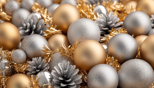 © pisan, Fototapeta premium Experience the magic of the holidays with a vibrant combination of tinsel and shimmering accents, evoking the joy of the holiday season This festive image features an array of gold and silver