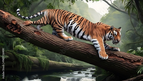 © Muhammad, Naklejka premium Experience the raw power and agility of the jungle with this high-resolution photograph of a tiger skillfully climbing a large, fallen tree bridging a jungle ravine.