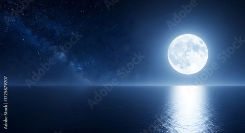 Obraz premium Experience the serene beauty of a full moon shimmering over a calm ocean under a starry night sky