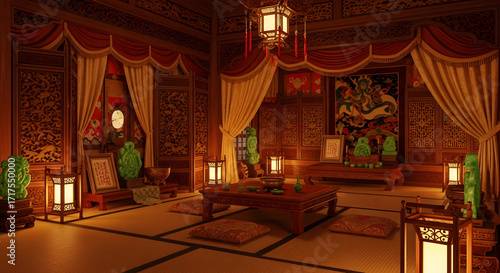 Obraz premium Experience the serene traditional elegance of an ornate Asian interior, with intricate wooden screens, warm lantern glow, and a magnificent cultural tapestry, evoking peace and luxury