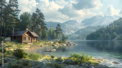 © Abdul, Fototapeta premium Experience the serenity of a secluded cabin surrounded by majestic pine trees in an untouched wilderness paradise