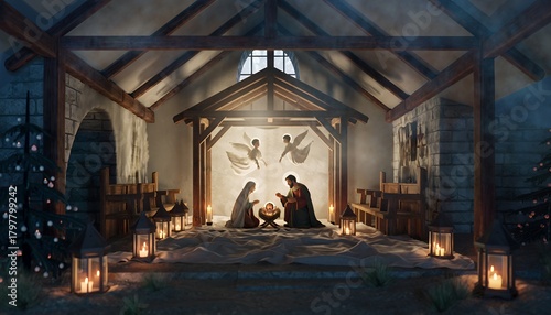 Obraz premium Experience the serenity of the Nativity scene with Mary, Joseph, and baby Jesus under the watchful gaze of angels, a symbol of hope and peace this Christmas