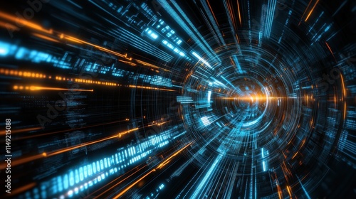 Fototapeta premium Experience the surge of energy and innovation in this abstract visualization of digital data in motion, showcasing vibrant blues and fiery oranges in a mesmerizing, futuristic tunnel.