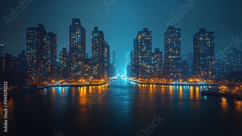Naklejka premium Experience the vibrant energy of a city skyline at night, with illuminated skyscrapers reflecting on the water. This urban landscape captures modernity and dynamic city life.
