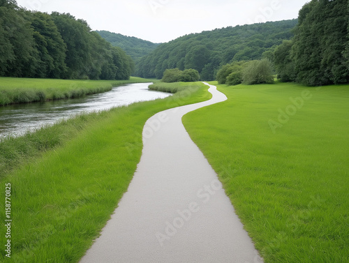 © Sekai, Obraz premium Experience Togetherness: Tandem Biking Adventure Along Serene Riverside Pathways Pedaling Upwards