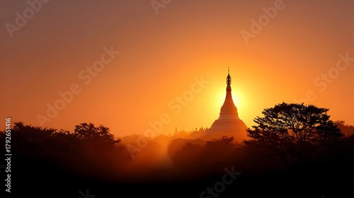 © pkproject, Obraz premium Experience tranquility with this breathtaking scene of a luminous stupa bathed in the warm glow of a golden sunset surrounded by silhouetted trees and atmospheric mist