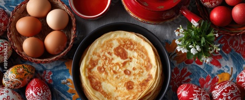 Obraz premium Experience vibrant spring traditions featuring warm pancakes and festive...