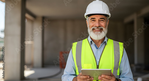 © Sulfabndi, Fototapeta premium Experienced engineer smiling confidently at a construction site, holding a tablet, ready to oversee the project and ensure its success.