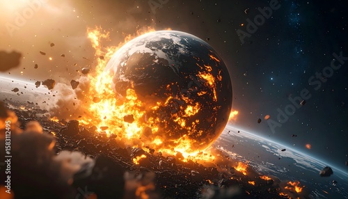 © Desmon, Fototapeta premium Exploding planet in outer space, dynamic fire and light, sci-fi background