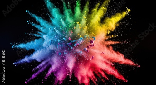 © MFaisal, Fototapeta premium Exploding Rainbow Powder Cloud Against Black Background - Vibrant Color Burst.
