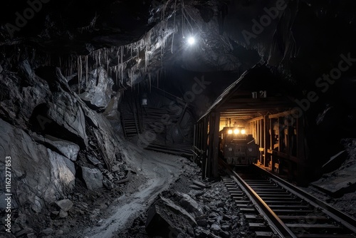 Naklejka premium Exploration of a cave featuring a railway track.