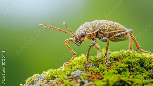 © Thavesak, Fototapeta premium Exploration of Miniature Wonders: Macro Bug on Mossy Rock