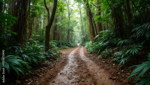 Fototapeta premium Explore a muddy rainforest path with towering trees and hanging vines