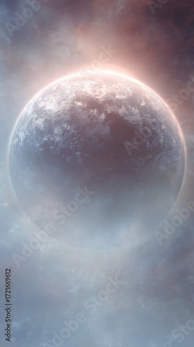 Fototapeta premium Explore a mystical planet nestled within a cloudy sky, showcasing a serene and ethereal space scene ideal for scientific research, cosmic exploration, and inspiring dreamlike concepts that spark