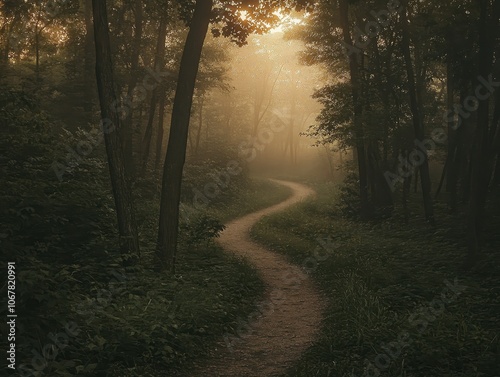 Fototapeta premium Explore a serene forest path at sunrise with rising mist and abundant free space