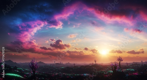 Obraz premium Explore a stunning alien landscape with vibrant glowing flora and a breathtaking sunset sky