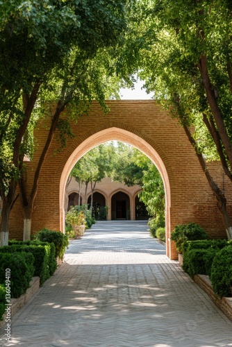Fototapeta premium Explore a tranquil garden pathway leading to an elegant courtyard, framed by lush trees and classic brick archways in a serene outdoor setting