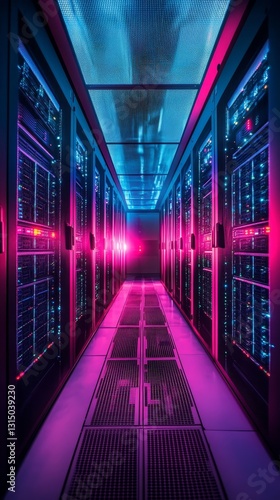 © Cloudyew, Fototapeta premium Explore a vibrant data center corridor featuring illuminated server racks, showcasing a modern IT infrastructure designed for efficient data management and connectivity.