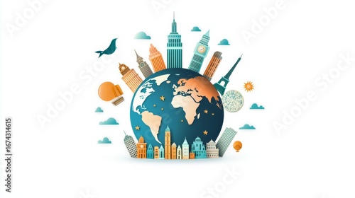 Naklejka premium Explore iconic landmarks around the globe with a colorful world illustration...