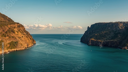 © Marius, Fototapeta premium Explore the breathtaking beauty of a serene ocean inlet framed by majestic cliffs bathed in golden sunlight