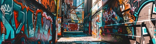 © panyawatt, Fototapeta premium Explore the intersection of street art and AI advancements Show a graffiti-covered alley with hidden digital elements blending seamlessly Use photorealistic textures to enhance the
