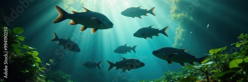 Fototapeta premium Explore the serene beauty of underwater life, featuring a graceful school of fish swimming in sunlit waters, perfect for marine conservation and nature-themed projects.